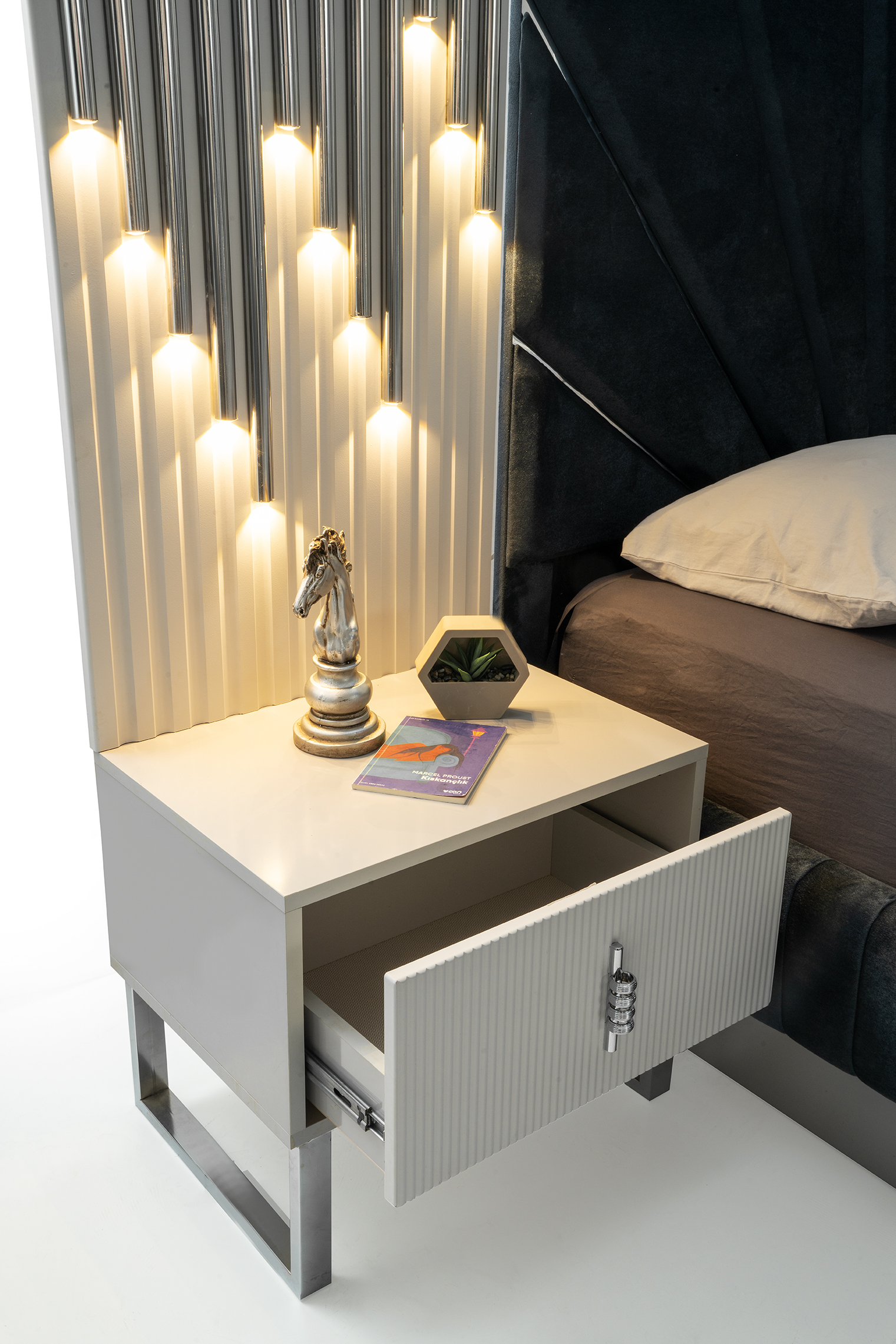 Sevin Home beyazımsı komodinler, soft renk tonları ve zarif tasarımıyla yatak odanıza şıklık katıyor. Kullanışlı çekmeceleri sayesinde eşyalarınızı düzenli tutarken, estetik detaylarıyla odanıza ferah ve modern bir görünüm sağlar.