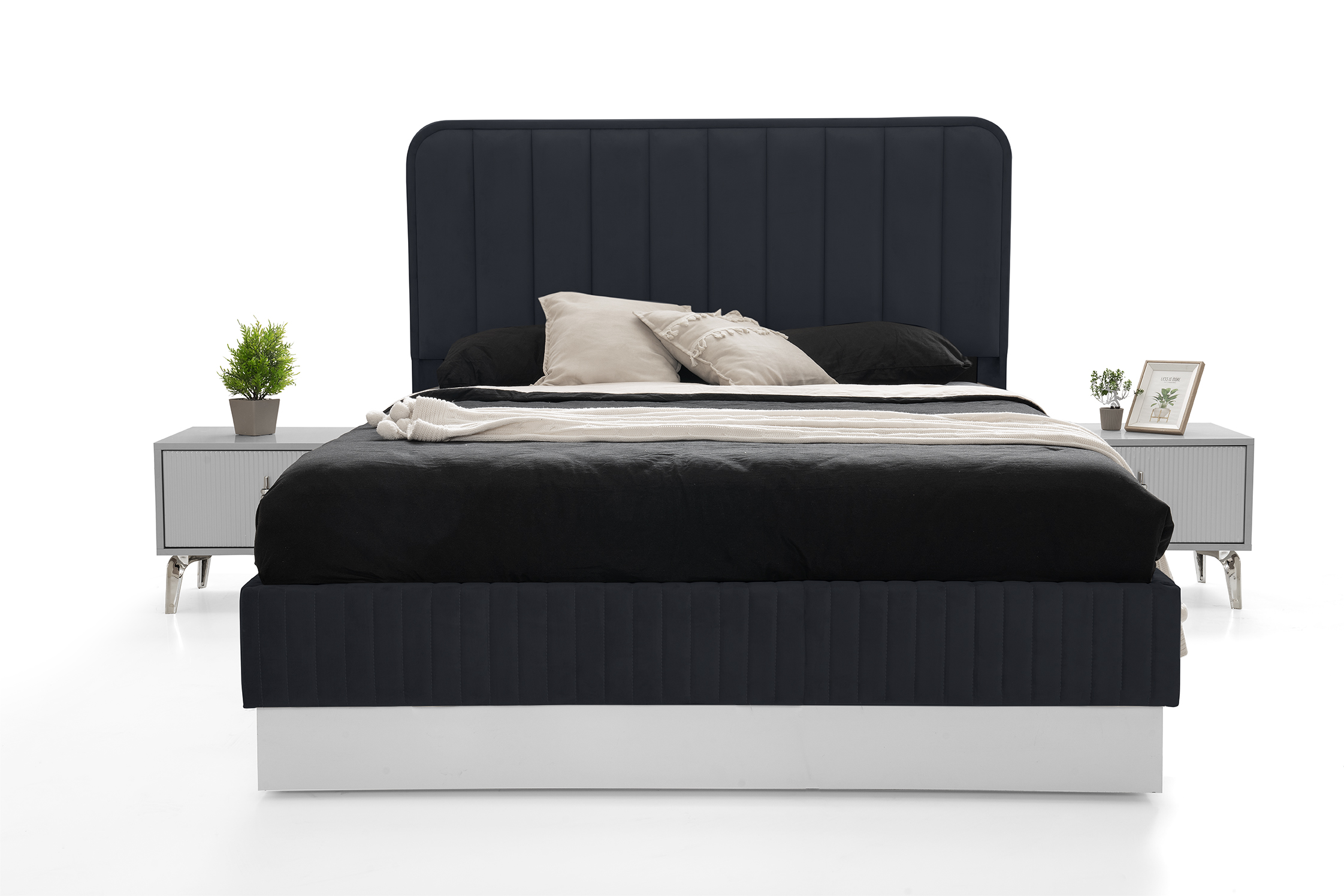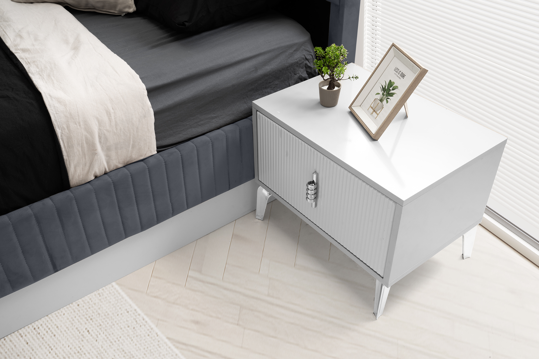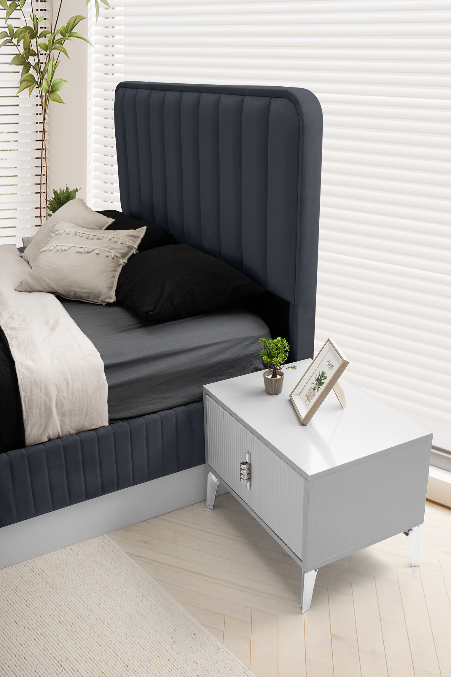 Sevin Home gri komodin, modern tasarımı ve şık gri tonlarıyla yatak odanıza zarafet katıyor. Kullanışlı çekmeceleri sayesinde eşyalarınızı düzenli tutarken, estetik çizgileriyle odanıza ferah ve sofistike bir görünüm sağlar.